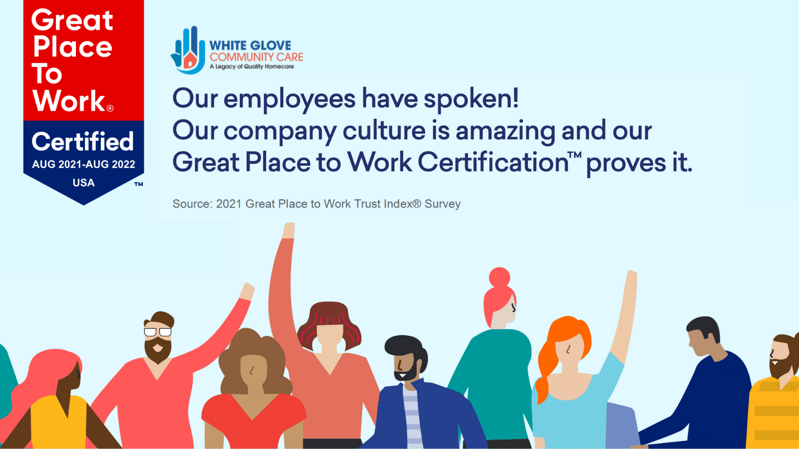 White Glove Community Care is proud to announce that we have been Certified™ by Great Place to Work®! This prestigious award is based entirely on what current employees have said about their experience working with us at White Glove Community Care. This year, 90% of our employees said it’s a great place to work – 31 points higher than the average U.S. company.