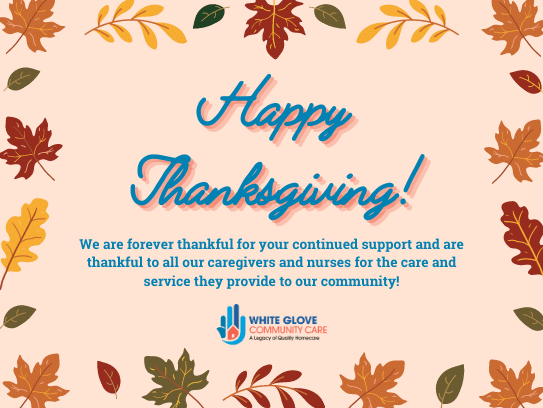 We would just like to thank all our caregivers and nurses for all they do for our community. We also want to thank all the families who continue to choose us to help care for their loved ones. We appreciate having you as part of our White Glove Community Care family and we wish you and your loved ones a safe, warm, and enjoyable Thanksgiving season.